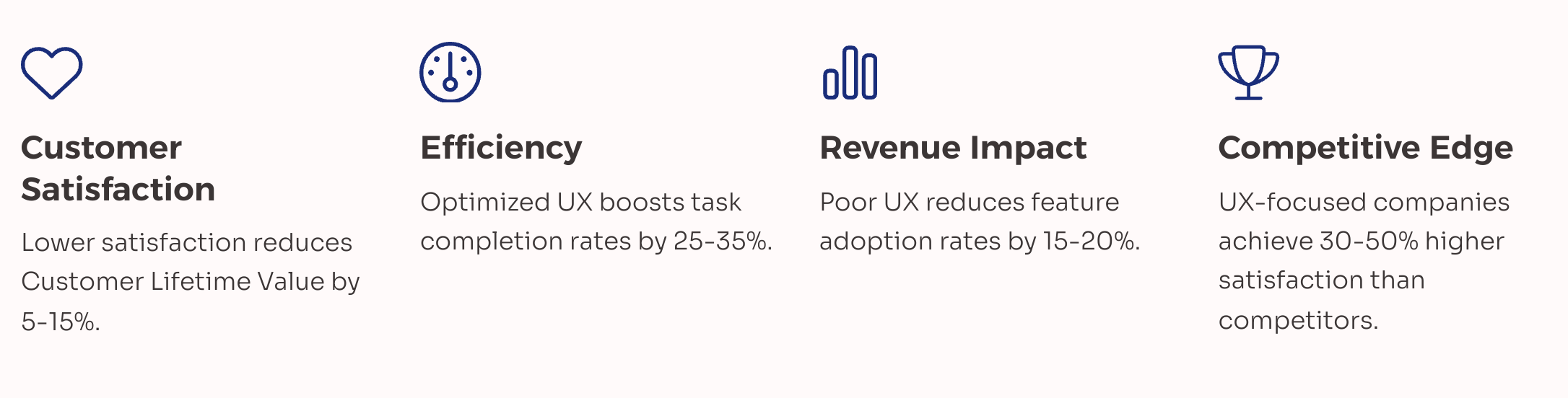 • Market Position: Companies prioritising UX achieve 30–50% higher satisfaction than competitors, giving them a clear advantage (Watermark Consulting, 2021).