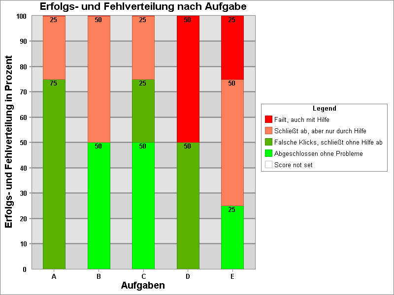 The diagram shows the users’ success distribution in percent. The tasks B, D, E, which have a high failure rate, are to be emphasised.