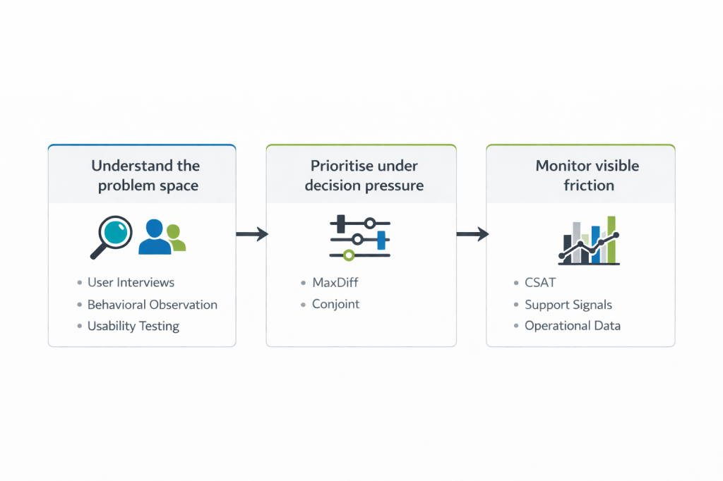 That is why I do not see these methods as competitors. They do different work. Qualitative research helps teams understand the problem space before friction hardens into dissatisfaction or escalation. CSAT and support signals help monitor where the experience is already producing visible pain. MaxDiff becomes useful when the team has enough context to compare options and needs a more disciplined way to decide what matters more.