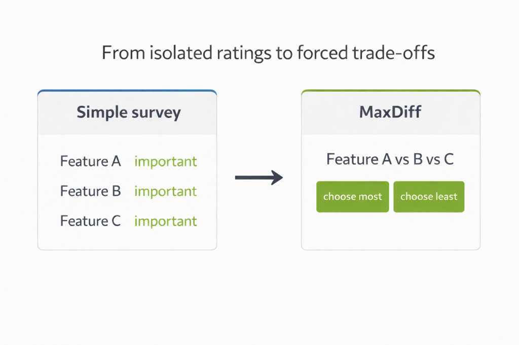 MaxDiff introduces decision pressure. Instead of asking whether a feature is generally liked, it asks respondents to choose which option matters most and which matters least from smaller sets, repeatedly. That shift may seem minor, but it changes the quality of the signal.